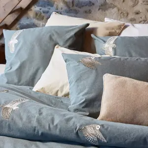 Nous y avons brodé d’élégantes chouettes effraies aux couleurs beiges et écru, mises en valeur par le fond coloris bleu céladon.